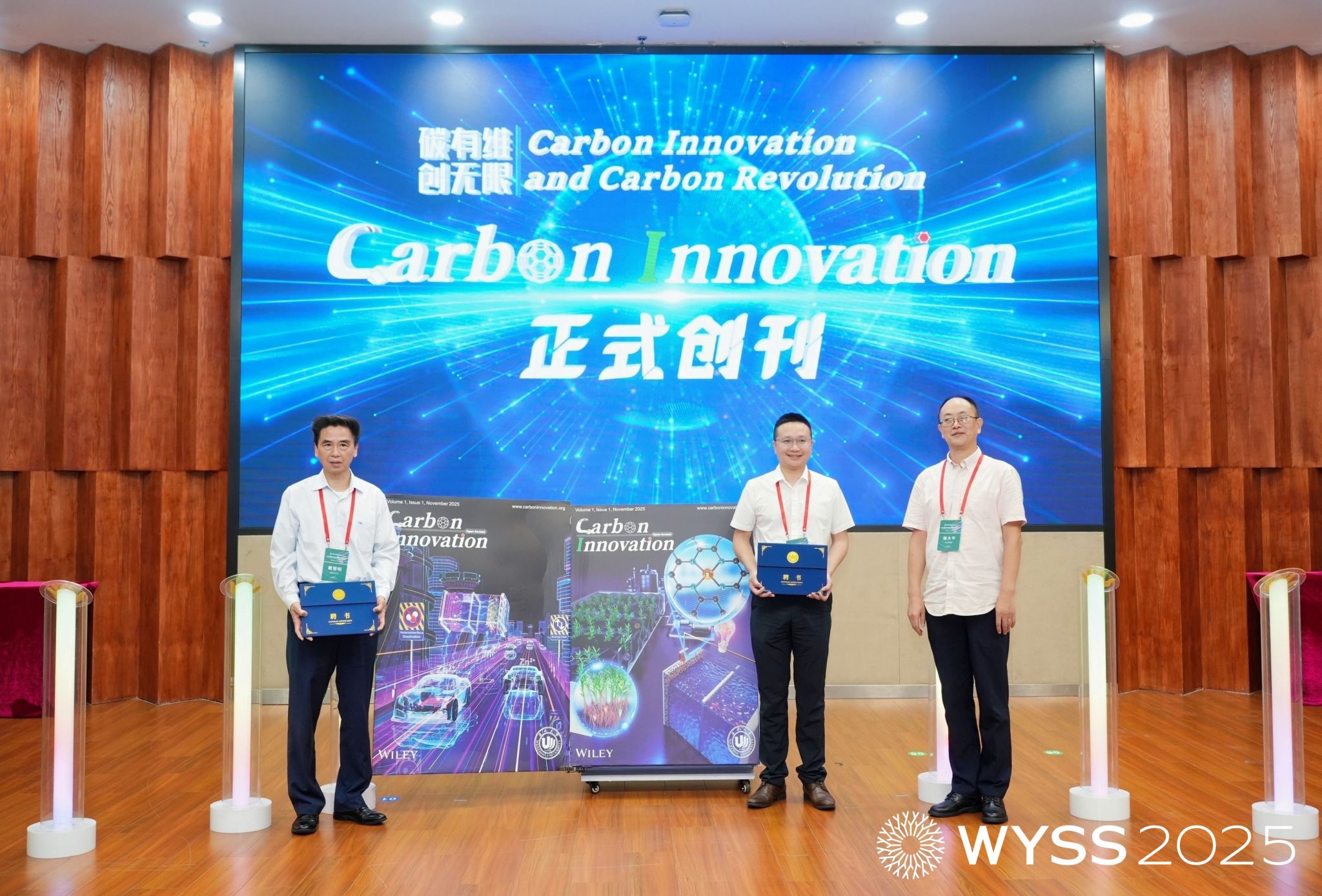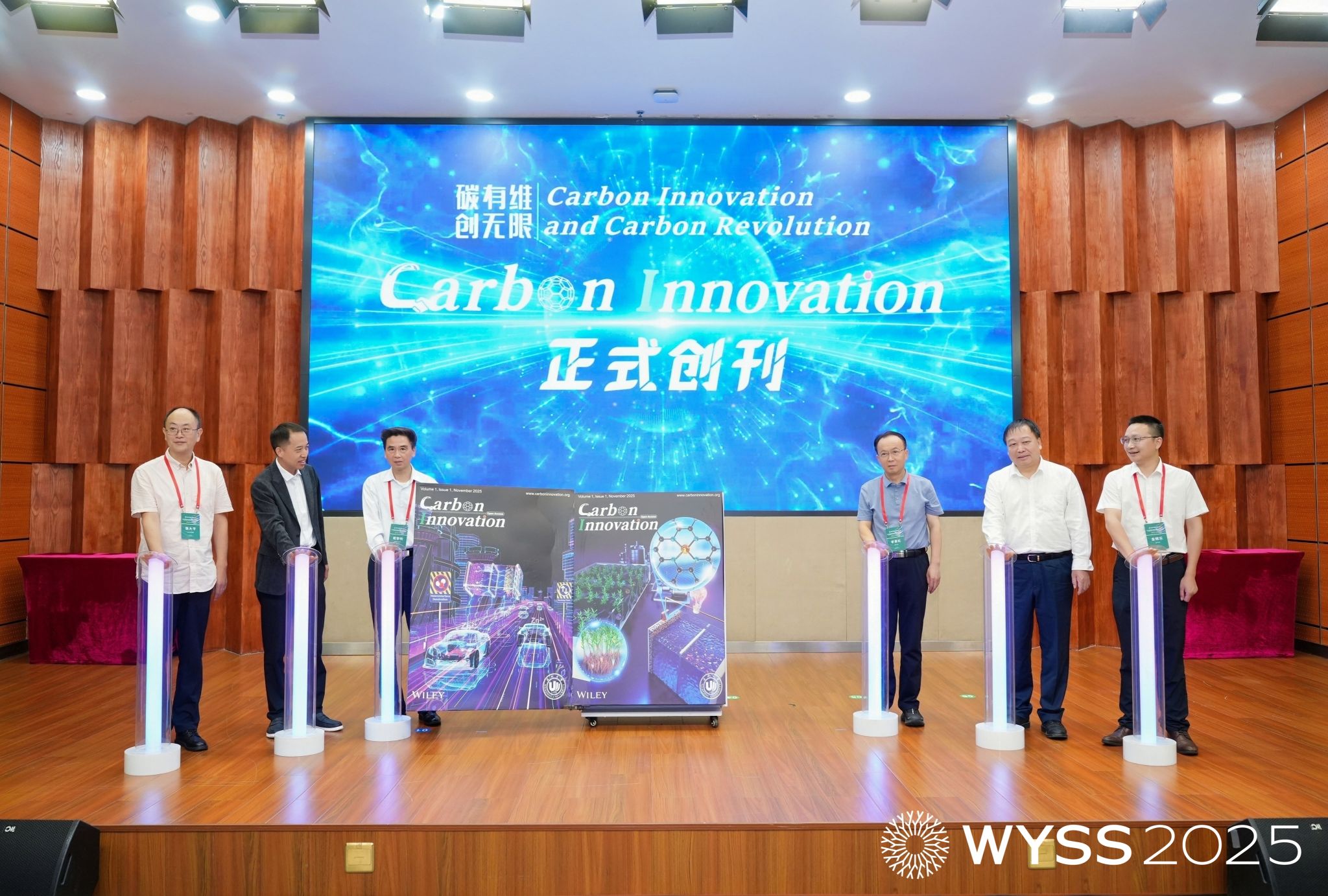 《Carbon Innovation》新刊启动仪式同步举行,戴黎明院士、李景虹院士、陈忠伟院士、赵敏校长、张大平总监、金辉乐副院长共同见证这一时刻,张大平总监还为戴黎明院士、金辉乐副院长颁发《Carbon Innovation》主编证书,标志着温州大学在碳能源领域国际学术传播平台建设再添新翼。